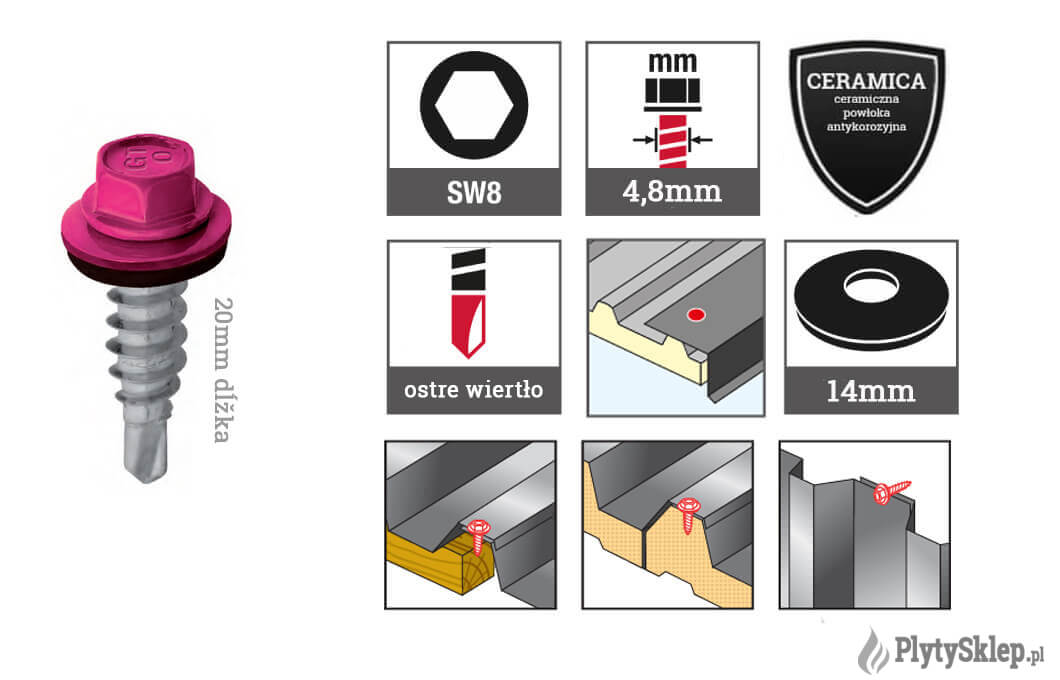 Zastosowanie wkrętów: mocowanie ściennych i dachowych elementów obróbki blacharskiej bez nawiercania, z użyciem wkrętarki akumulatorowej (1000–1800 obr./min) do płyt warstwowych. Długość wkrętów od 20 mm (L), średnica wiertła 4,8 mm, długość wiertła 5 mm. Za dopłatą możliwość wykonania w dowolnym kolorze RAL lub zakupu kolorowych zaślepek.
