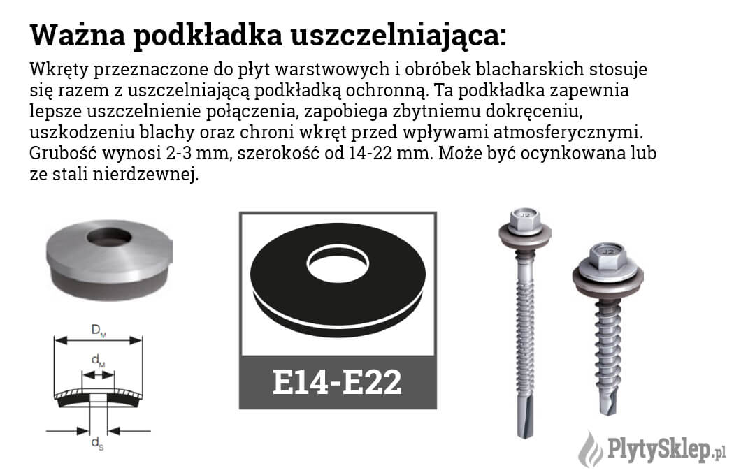 Jej grubość wynosi około 2–3 mm. Podkładki składają się z części metalowej (ocynkowanej lub nierdzewnej) oraz wulkanizowanej części EPDM. Rozmiary podkładek to: 14 mm do obróbek blacharskich oraz 16–19–22 mm do elementów płytowych. (prosimy o informację w sprawie dostępności)