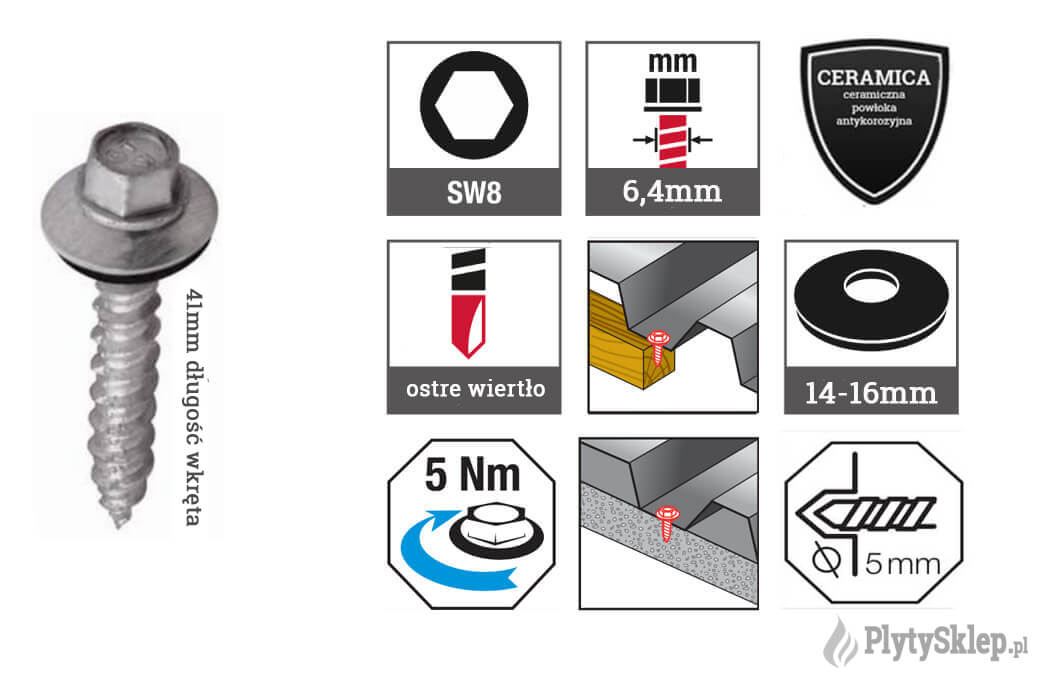Wkręty samowiercące TEX są wykonane z ocynkowanej stali szlachetnej z specjalną, antykorozyjną powłoką ceramiczną. Sześciokątna główka gwintowana 8 mm (10,5 mm średnica całej główki). Podkładka EPDM jest ocynkowana, wulkanizowana, o wymiarach 14–16 mm (standard). Długość wkrętów wynosi 41 mm (L), średnica wiertła 6,4 mm. Kategoria korozyjności do C4.