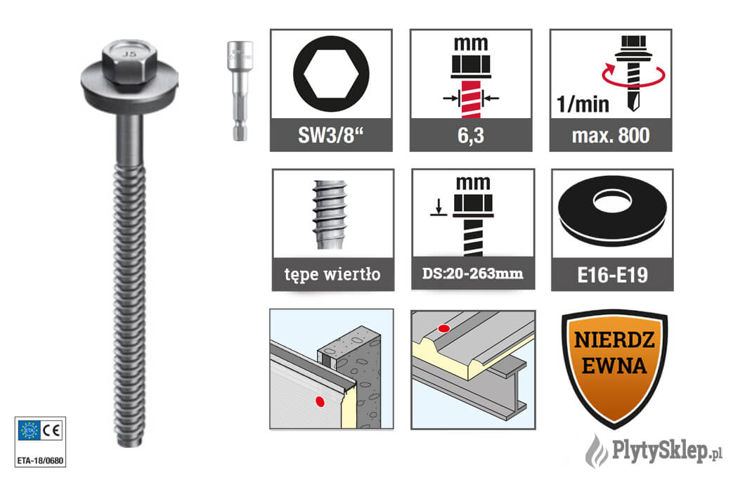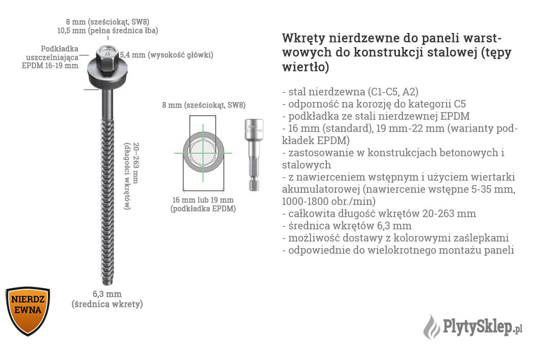 Wkręty formujące gwint do mocowania płyt warstwowych do konstrukcji stalowej (również betonowej). Wkręty samowiercące wykonane są ze stali nierdzewnej z wulkanizowaną i nierdzewną podkładką EPDM o średnicy od 16–22 mm, bez koloru. Grubość podkładki wynosi 3 mm. Średnica wkręta to 6,3 mm, szerokość łba 8 mm sześciokąt (bit = SW8). Tępe wiertło z wstępnym nawierceniem.